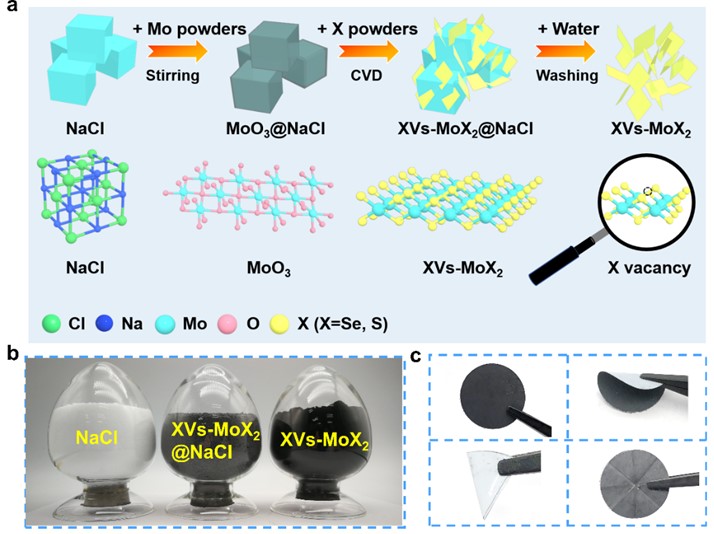 图1:利用CVD技术在盐模板上批量制备XVs-MoX2