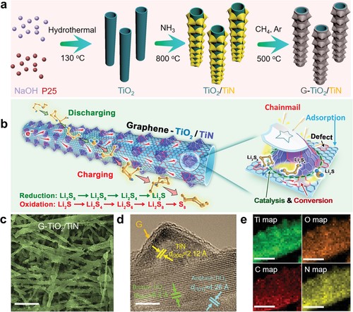 图1:a) G-TiO2/TiN三元异质结构的合成示意图。b) G-TiO2/TiN三元异质结构在硫化学中的作用示意图。