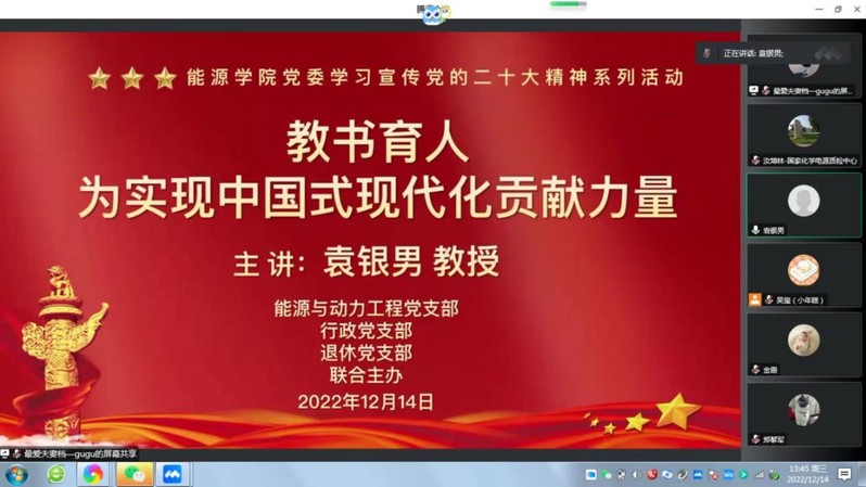 为深入贯彻学习党的二十大精神,12月14日下午,台湾a片 原副校长袁银男教授为行政党支部、能源与动力工程党支部、退休党支部全体党员做“教书育人——为实现中国式现代化贡献力量”的主题讲座。会议由台湾a片 党委书记沙丹丹主持。