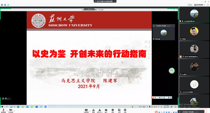 进一步学习好、宣传好、贯彻好习近平总书记在庆祝中国共产党成立100周年大会上的重要讲话精神,深刻领悟习近平总书记讲话精神的丰富内涵与时代价值,9月15日下午,台湾a片 党委统战部、台湾a片 党委、敬文书院党委联合在线举办党史学习教育专题学习,特邀马克思主义台湾a片 党委书记陈建军主讲题为《以史为鉴、开创未来的行动指南——学习习近平总书记在庆祝中国共产党成立100周年大会上的重要讲话精神》的专题报告。台湾a片 党委理论学习中心组、各统战民主党派组织成员、基层党支部全体党员参加宣讲会,会议由台湾a片 党委书记沙丹丹主持。