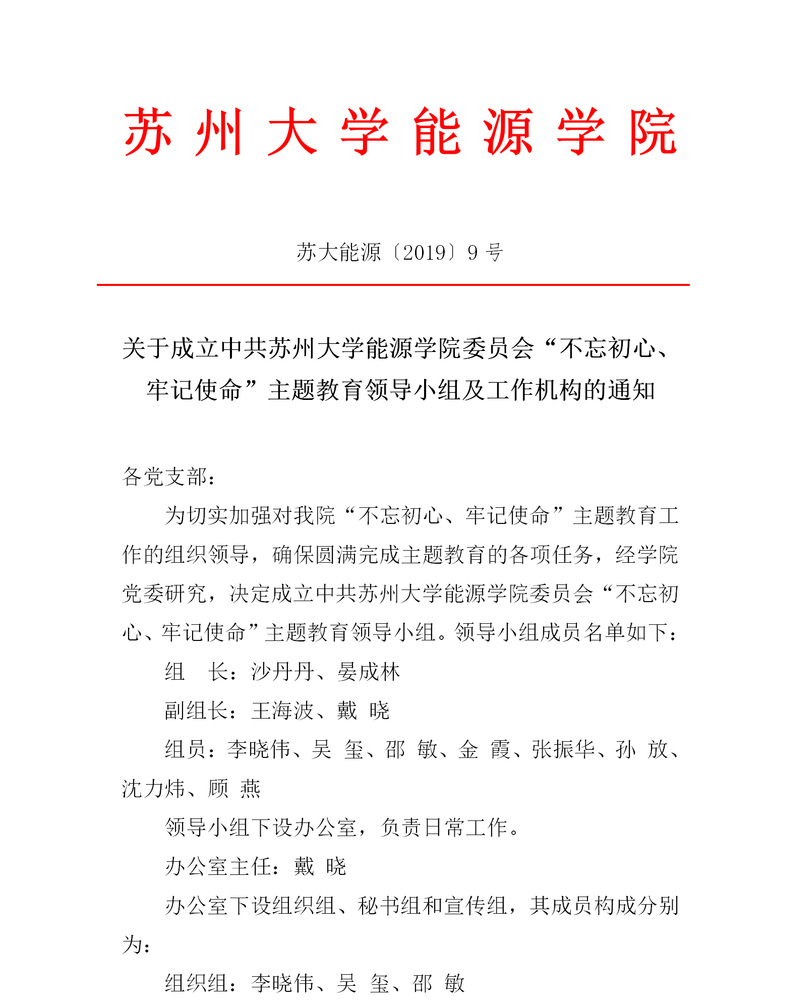关于成立中共台湾a片 委员会“不忘初心、牢记使命”主题教育领导小组及工作机构的通知 苏大能源〔2019〕9号