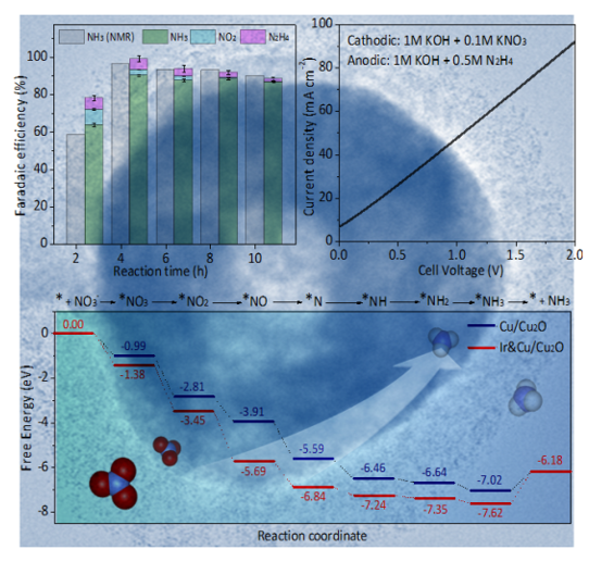 基于节能的考虑,低电压条件下实现硝酸盐电解制氨至关重要,但是如何提高其效率和选择性仍面临挑战。本论文报道了一种由多晶Ir&Cu 和非晶 Cu2O 构成的多级纳米球Cu0.86Ir0.14Oz,其表现出优异的NITRR催化性能, NH 3产率 (YR) 高达 0.423 mmol h−1 cm−2 (或 4.8 mg h−1 mgcat-1);在 0.69 V(或 0 VRHE )的低过电势下可实现大于90%的NH3法拉第效率 (FE)。此外,本论文首次报道了采用Cu0.86Ir0.14Oz//Cu0.86Ir0.14Oz电极对构建用于 NITRR 和肼氧化 (HzOR) 的电解槽,可实现高达 87% 的能量效率 (EE)。