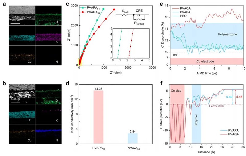 图4研究了聚合物对钾离子(K+)迁移动力学的影响,特别是在经过长时间电解反应后的PTFE/Cu/PVAPA54和PTFE/Cu/PVAQA54电极的比较。通过交叉截面SEM和EDX元素映射图可以看到两者在K+离子分布上的差异。对于PTFE/Cu/PVAPA54电极,K+离子渗透进入PTFE膜,而在PTFE/Cu/PVAQA54电极中,PVAQA54覆盖层有效地阻止了K+的迁移。电化学阻抗谱结果显示,PVAQA54的K+离子导电率为2.84 mScm−1,而PVAPA54的为14.36 mScm−1,进一步验证了PVAQA的阻钾效果。AIMD模拟结果显示,PVAQA中的K+离子在5秒内被排除出MODL区域,而在PVAPA中,K+则会向内赫尔姆霍兹平面移动。这些结果表明,PVAQA54聚合物层能够有效地阻止K+的迁移,从而提高电极在二氧化碳还原中的性能。