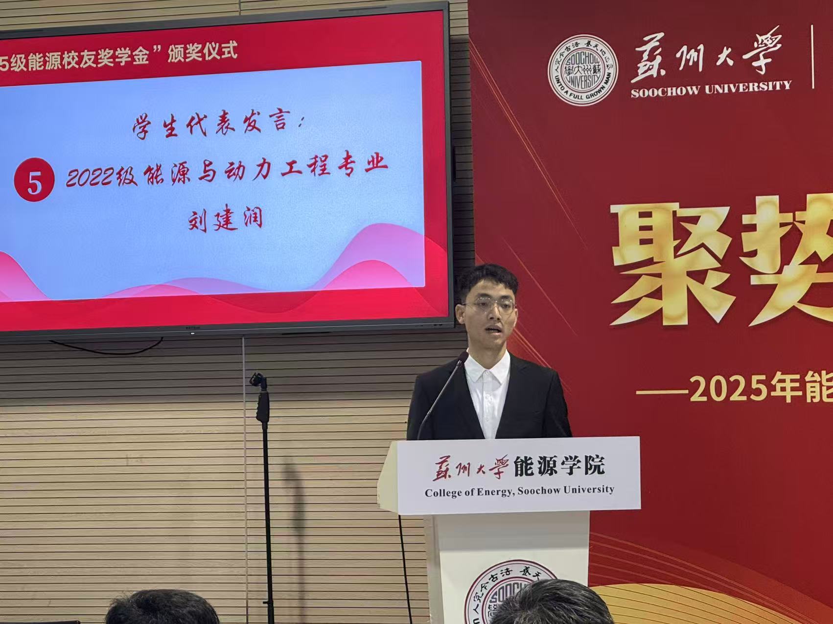 2022级学生刘建润作为获奖学生代表发言,感谢各位优秀校友一直以来对后辈学子的关怀和支持,表示会以优秀校友为榜样,努力学习专业知识,提高实践能力。