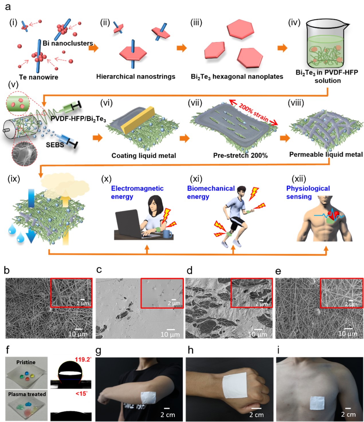 图1:TPEG-skin的结构设计与成分表征。a.典型透气和可拉伸TPEG-skin的制造流程示意图,以及其在复合电磁和生物机械能量收集与自供电生理感应中的应用场景。b-e.材料的形貌表征。f.等离体子处理前后的接触角。g-h. TPEG-skin与人体紧密贴合的照片