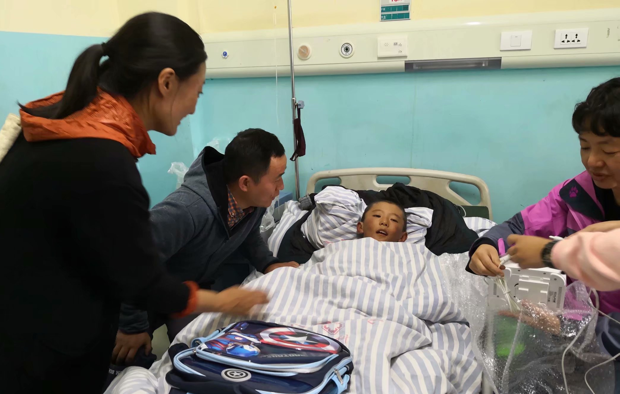周六的校园是安静的,支教团又在老师的带领下,走进玉树州八一医院,大家一起亲切看望了一位住院的九岁藏族男孩,并与他相约早日在校园里见到他……