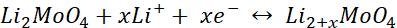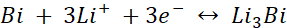 结合材料的CV测试分析(图2a),对BMO负极材料进行原位同步辐射XRD表征,如图2b-c所示,BMO初次嵌锂经历不可逆的转换反应,生成Li2MoO4和金属Bi(公式1),对应于首圈CV曲线中的2.07 V还原峰(图2a)。在后续的电化学储锂过程中,如公式2所示,Li2MoO4通过形成Li2+xMoO4进行锂离子的可逆嵌脱反应,贡献储锂容量,对应于CV曲线中1.16/1.62 V的氧化还原峰对。另一方面,在低电压下,Bi转变为Li3Bi合金,进行合金化和去合金化可逆储锂(公式3),对应于CV循环上约0.6/1.0 V的氧化还原峰对。BMO负极材料电化学嵌锂机理,如图2d和如下反应式1-3所示。
