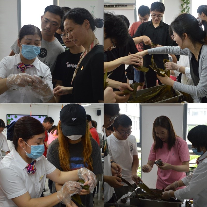 同时,阿姨娴熟地为师生展示包粽子的方法:折粽叶、装馅料、裹叶子、缠棉线。大家在阿姨的指导下纷纷动手尝试,包出各式各样的粽子。在一个多小时的等待后,大家终于品尝到了美味的粽子,体会到劳动的喜悦。