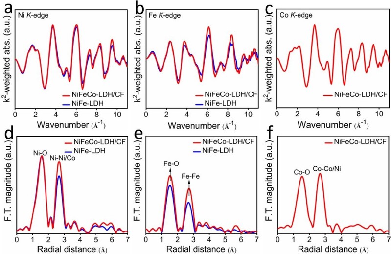 图5. NiFeCo-LDH/CF材料与对比样NiFe-LDH的(a-c)Ni、Fe、Co K边EXAFS振荡光谱和(d-f)Ni、Fe、Co K边傅里叶变换FT-EXAFS光谱。