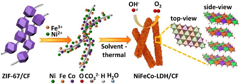 图1. NiFeCo-LDH/CF复合电催化剂的合成过程示意图。