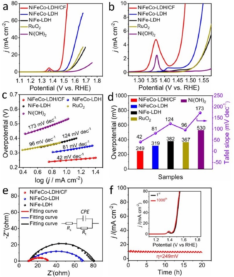图6. (a)NiFeCo-LDH/CF材料与对比样的在1M KOH电解液中的OER极化曲线;(b)放大的极化曲线显示了不同样品的氧化峰;(c)对应的Tafel斜率;(d)电流密度为10 mA cm-2时的过电位,以及Tafel斜率对比图;(e)电化学交流阻抗谱;(f)对应过电位为249 mV时的计时电流图,插图为1000 CV循环后的LSV曲线。