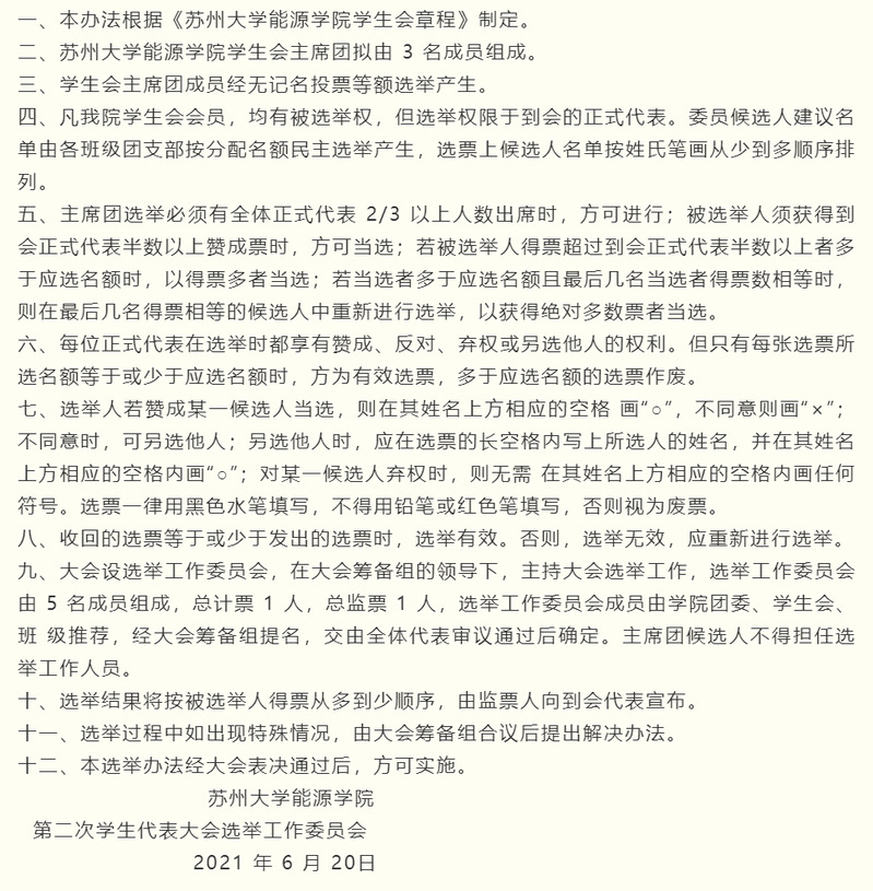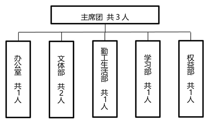 (一)组织架构为“主席团+工作部门”模式。实行轮值制度,学生会主席团集体负责学生会重大事项,不设主席、副主席,设执行主席,执行主席由主席团成员轮值担任,以一个学期为轮值周期,执行主席负责召集会议、全面负责日常工作;