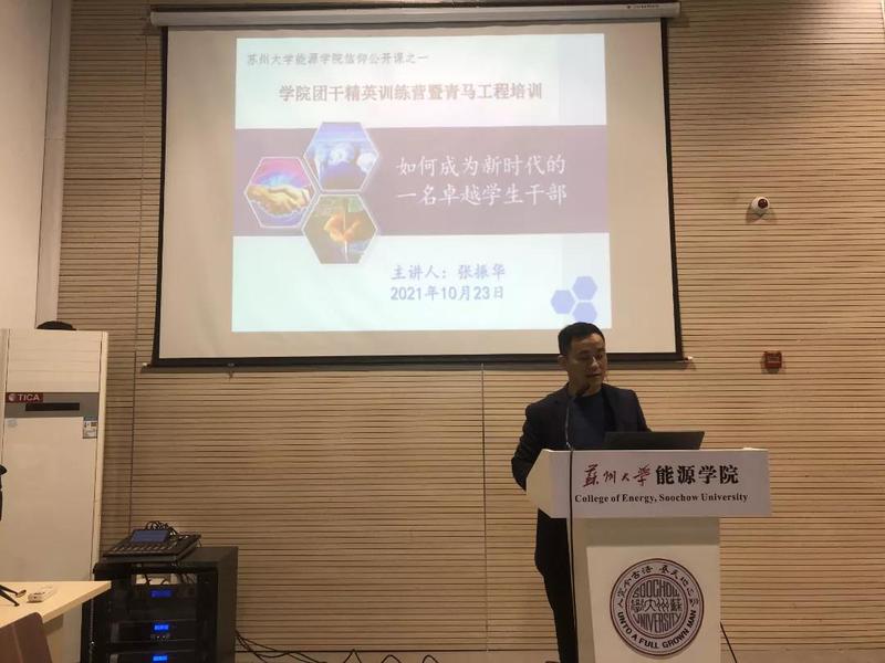 10月23日晚,台湾a片 团干精英训练营暨青马工程第四期培训在新能源大楼多功能厅121如期举行。作为团委开展增能计划的一部分,团委书记张振华老师以“如何成为一名卓越的学生干部”为题向台湾a片 2020级、2021级所有班团干部和院各学生组织的青年骨干主讲了本次信仰公课。