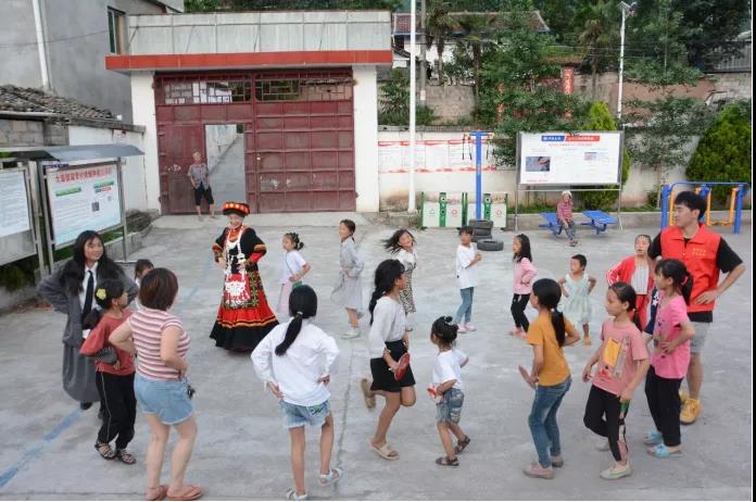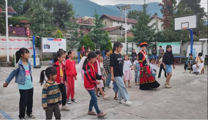 为了感染更多的孩子热情参与,“朵儿计划”创始人任爽来到大山前自学了彝族特色舞蹈《阿诗且》,朵儿姐姐配上鲜亮的民族服饰欢快的跳起来,迅速带动了校园里的孩子们欢呼雀跃地加入进来……