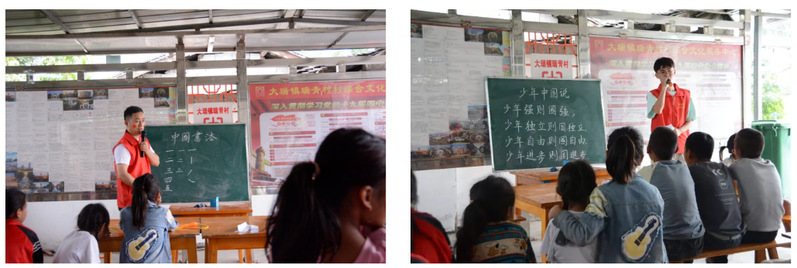 张振华老师在棚子下面的小黑板上向孩子们讲起了中国书法的美学艺术,随后在黑板上书写了《少年中国说》,志愿者赵志明带领全体孩子激情澎湃地朗诵,激发了大家的爱国热情。