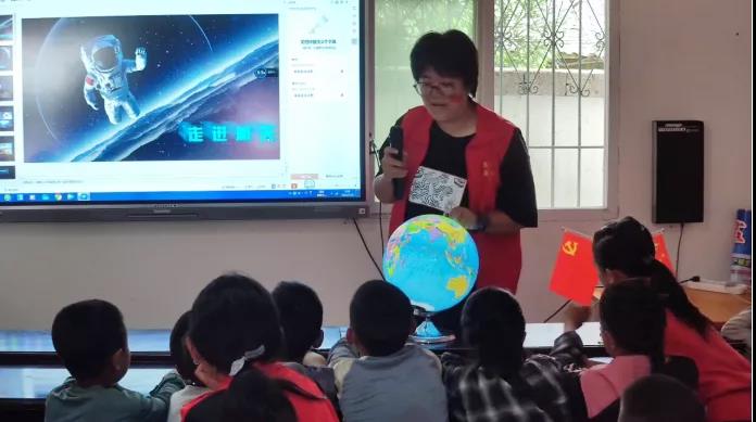 在活动室,志愿者夏欣瑶通过图文并茂的PPT和视频,为小朋友们讲解了航天知识,激发了他们的好奇心,在他们心中种下了崇尚科学、探索航天的种子。