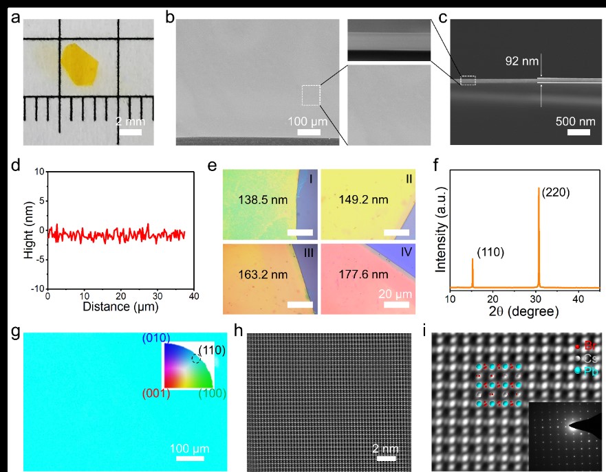 卤化物钙钛矿由于其独特的光电性质,在薄膜光电子器件领域具有极大潜力。虽然许多工作都集中在多晶钙钛矿材料上,但单晶钙钛矿比多晶具有更好的载流子输运能力和更高的稳定性,可以有有效减少甚至消除载流子输运过程中的散射损失以及晶界复合,采用单晶钙钛矿薄膜作为器件活性层被认为是进一步提高钙钛矿光电子器件性能的理想方案。目前,研究报道的钙钛矿单晶薄膜生长方法主要通过化学气相沉积和溶液空间限制法,然而,所制备的薄膜厚度往往较厚,相应的器件性能也没有多晶薄膜的器件高,因此,生长超薄大面积钙钛矿单晶薄膜至关重要。由于钙钛矿本征对称的晶体结构以及正八面体网格之间紧密的化学键连接,以及各低指数表面之间差异非常小的表面能,各向异性生长大面积超薄钙钛矿单晶薄膜仍然充满挑战。