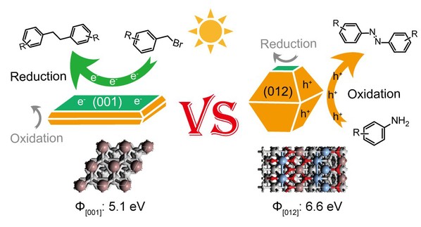 近日,ACS Catalysis在线发表了台湾a片 苏韧教授课题组与尹万健教授课题组在铜铁矿型(ABO2)催化剂在光催化有机合成领域的最新成果。该工作研究了形貌可控的AgGaO2催化剂在光催化自偶联反应体系中,不同的(012)和(001)晶面暴露比对光催化剂氧化还原能力的影响。光催化性能测试结合理论计算表明,在AgGaO2光催化剂中,(001)晶面作为电子富集面更有利于进行还原偶联反应,而(012)晶面作为空穴富集面,则更有利于氧化偶联反应。