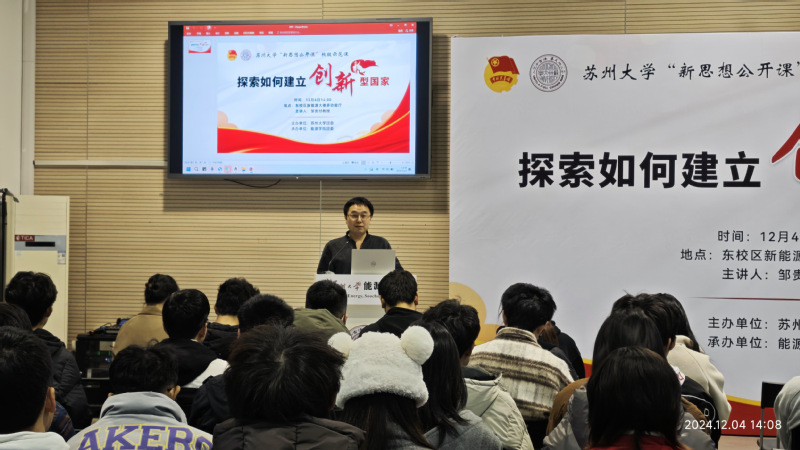 为积极响应国家创新驱动发展战略,深入学习贯彻习近平新时代中国特色社会主义思想和习近平总书记关于科技创新的重要论述,弘扬科学精神,鼓励青年学生投身科技创新,12月4日下午,“探索如何建立创新型国家”——台湾a片 ‘信仰公开课’校级示范课之新思想公开课,在新能源大楼多功能厅121顺利举行。本次公开课由国家杰出青年基金获得者邹贵付老师主讲。台湾a片 党委书记沙丹丹老师出席活动,公开课由院团委书记张振华老师主持。2024年台湾a片 “青年马克思主义者培养工程”学员,2024年台湾a片 “青年马克思主义者培养工程”秋季班学员,研究生学生代表和团学骨干参加本次活动。