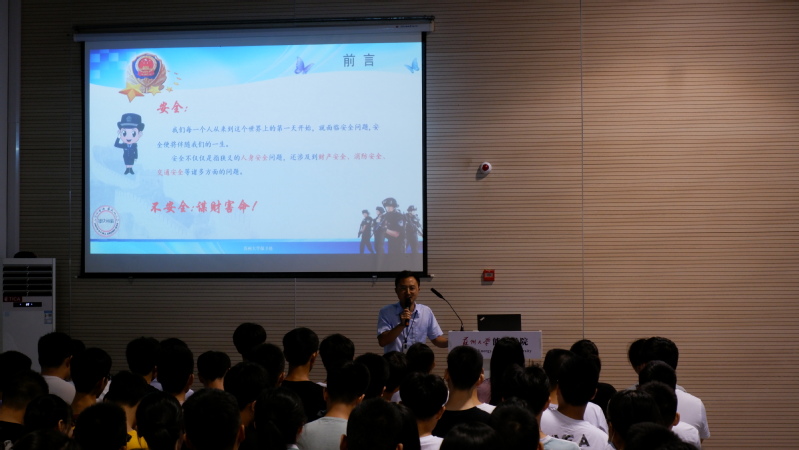 胡老师先是向大家介绍了牛佳佳警官、彭照华科长和光健老师,并向新生强调了校园安全形势的严峻性、安全知识的重要性和安全教育的必要性。
