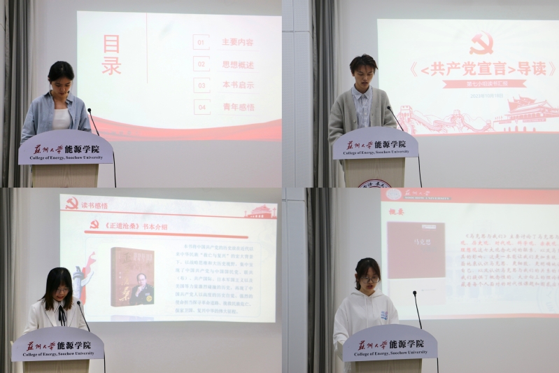 第二部分由本期读书会的七个读书小组分别进行读书成果分享。第一小组同学负责研读的书目为《马克思与我们》,他们用独特的视角分析书中传递的重要观念理念,并就马克思主义哲学与人生的关系问题展开了深入的讨论,提出了丰富的现实意义和潜在价值。第二组学员用精彩细致的材料介绍了《百名院士的红色情缘》中众多院士感人至深的成长奋斗之路,并由此全面赏析了院士的坚韧毅力与卓越品质,激励在座的学员们不惧困难、博学笃行,牢记时代新使命,身体力行创新思,孜孜追寻中国梦,将先辈们孕育出的红色精神赓续传承。第三组同学代表围绕《品味红色经典》一书,从必要性和关键性两个方面阐述了红色文艺的存在理由。红色文艺源远流长,蕴藉深厚,对国家与人民意义阔大,也由此生动说明了为何红色文艺创作内容具有其多样性、革命性与时代性的特征,让学员们深刻牢记红色信仰从何产生,因何坚定。第四组学员向我们分享了《正道沧桑》的内容特点与主旨立意,重点讲述了百年来中国共产党从无到有,发展壮大波澜壮阔的光辉历程,突出展现中国革命的筚路蓝缕,并进一步体现出中国共产党所领导革命的丰富历史意义与带给我们的独特历史影响,促使广大学员坚定自我认同,驱动人生奋斗。第五组同学代表就《平语近人》中习近平总书记的经典语录,做出了富有思辨价值的个人理解,并剖析了当代中国梦与核心价值观的密切关联,强调党性学习对青年政治素养提升与社会责任感建立的关键作用。第六组成员通过简述《共产党员的力量》中所描绘共产党人的优秀作风与榜样形象,对共产党的力量进行了详细、深入的溯源探寻,赞美了中国共产党的奋斗与荣光,同时也对学员们在个人贡献与精神风貌层面提出众多极具意义的要求。第七组围绕书目《<共产党宣言>导读》,从共产党宣言的历史价值和思想营养、共产主义的必然性、意识形态格局三方面展开了讨论,指出了马克思主义在不同历史阶段中的变化发展,并借此重申马克思主义中国化的合理性,警示学员同学们不忘初心,坚定信念,为新时代中国特色社会主义建设添砖加瓦。