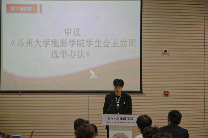 会上,陈柯伽同学代表台湾a片 第四届学生委员会向大会作题为《聚焦目标不松劲,勇立潮头攀新高——带领广大青年学子立于时代之巅,共担时代之责》的工作报告,随后王冠朝、王泉彬同学分别向大会作了《台湾a片 学生会章程修订工作报告》、《台湾a片 学生会提案工作报告》,经过大会审议,三项工作报告获得了代表们的一致通过。