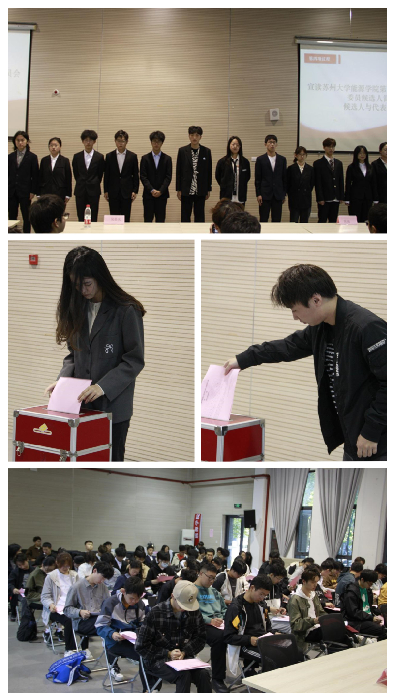 在选举环节中主持人宣读台湾a片 第五届学生委员会委员候选人简介,候选人一一与代表见面。之后,工作人员分发选票,各学生代表充分行使民主权利,井然有序地进行台湾a片 学代会委员的选举。