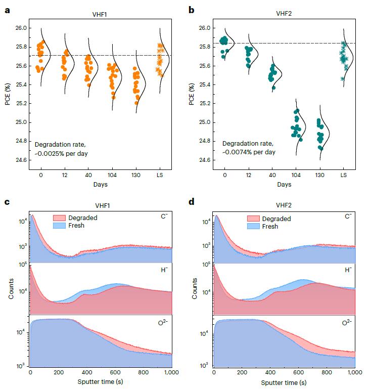 2. 通过优化VHF1-nc-SiOx:H(n)窗口层,在丝印银电极全面积M6双面SHJ电池上实现25.98%的认证效率,与VHF2电池效率(26.02%)相当。同时,VHF1电池比VHF2电池表现出更小的暗衰。(130天内,VHF1电池平均衰减速率:约0.0025%/天,仅为VHF2电池的1/3(约0.0074%/天))。并且,VHF1电池在经过光浸泡后效率几乎可以全部恢复(-0.04%),而VHF2电池效率损失相对较大(-0.15%)。