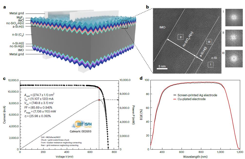 为充分挖掘硅异质结(SHJ)太阳电池的性能潜力,需要进一步减少寄生吸收和栅线遮挡。然而,纳米氧化硅(nc-SiOx:H)窗口层和镀铜电极的低成本和规模化制备仍然是主流SHJ技术的最大障碍之一。基于此,苏州迈为研发团队通过开发具有最小化驻波效应的工业规模甚高频等离子体增强化学气相沉积系统来解决第一个挑战。同时,结合无种子层铜电镀技术制备的高质量铜电极,在M6尺寸双面SHJ电池上实现26.41%高光电转换效率。台湾a片 杨新波教授团队对nc-SiOx:H(n)层的微观结构、界面演变、大面积均匀性、暗衰机理、电池效率损失分析等方面做了大量深入的研究。这项工作为高效率异质结电池的大规模产业化铺平了道路。