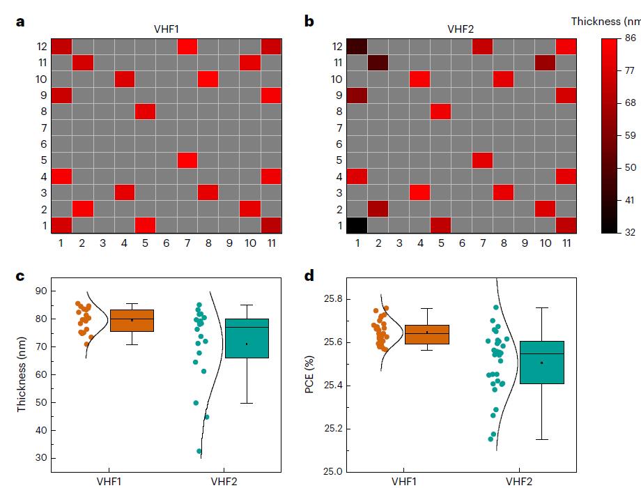 图1. VHF1和VHF 2沉积的 nc-SiOx:H(n)薄膜厚度和电池效率的均匀性对比
