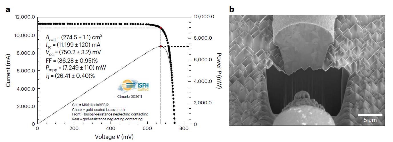 3. 结合无种子层铜电镀技术,更窄的铜栅线(约9µm),更低的体电阻(2.1 μΩ·cm)和接触电阻(0.5 mΩ·cm2)将电池Jsc和FF进一步提高至40.80 mA/cm2和86.28%,将M6全面积双面SHJ电池认证效率提升至26.41%,这也是铜电镀电池目前报道的效率最高值。