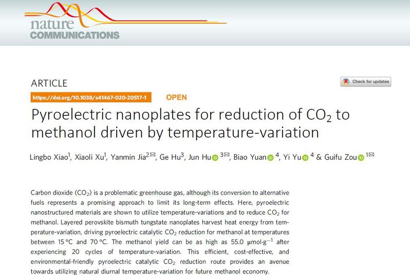 这是首次采用热释电材料从温度变化中获取能量来进行二氧化碳还原,利用此方法可以有效的将二氧化碳还原为甲醇。这种经济环保的二氧化碳还原方法为将来利用自然界中的温度变化进行甲醇生产提供了一条途径。(DOI: 10.1038/s41467-020-20517-1))