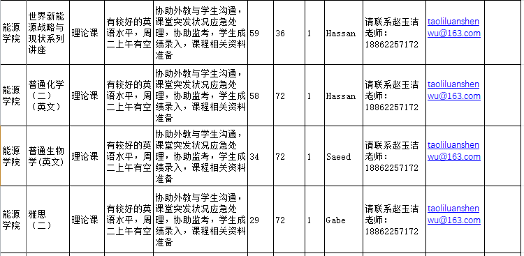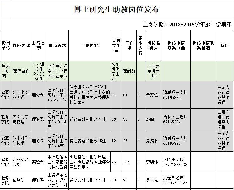 三、聘任流程:应聘博士生对照网上发布的助教岗位信息表在经导师同意后,10月24日(周一)前提交《台湾a片 博士生助教岗位申请与聘用表》(附件3)到台湾a片 教学办公室王老师,各位同学必须在10月24日(周一)前联系下面表格中的岗位联系电话和联系老师进行聘任考核并完成岗位聘任,逾期不予聘任。上学期已经应聘完成助教工作的2018级博士生不用再做此工作。