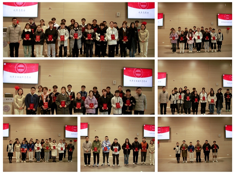 随后是表彰环节,依次颁发了“优秀学生干部”、“优秀学生组织志愿者”、“暑期社会实践优秀个人”、“优秀志愿者”、“优秀团干部”五个奖项。四位老师分别为各位获奖同学颁奖,并合影留念。