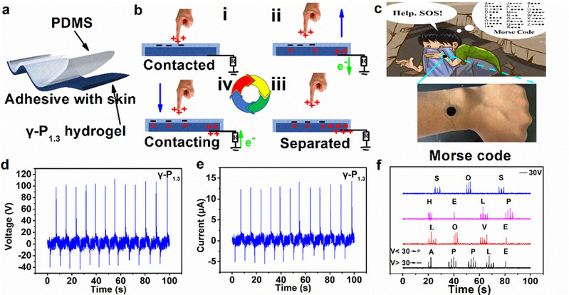 摩擦纳米发电机 (TENG) 触觉传感器。(a)TENG示意图, (b)TENG在单电极模式下的工作原理, (c) 触觉传感器的示意图显示了TENG通过摩斯密码进行通信, (d-e)通过1MΩ电阻器接地的TENG的输出电压(d)和电流(e), (f)触觉传感器通过摩斯密码进行通讯。