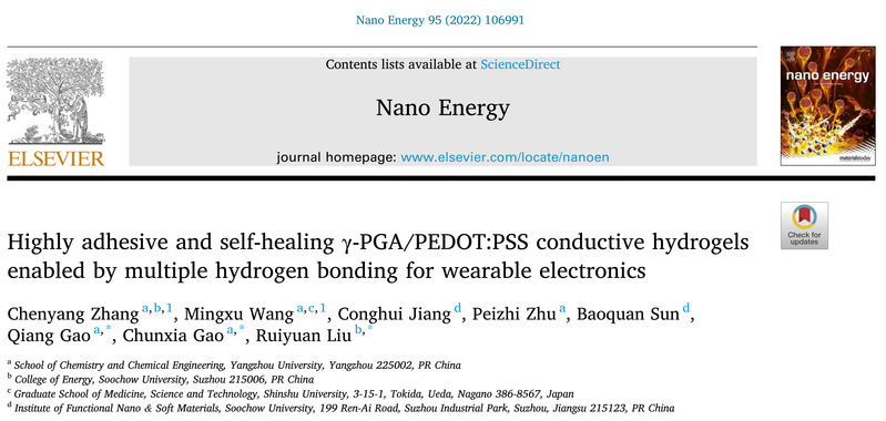 本工作将具有优异导电性能的PEDOT:PSS引入生物基γ-PGA水凝胶系统中成功制备了一种兼具高粘附性、自修复、导电性能和生物相容性的γ-PGA/PEDOT:PSS水凝胶,并用于人体活动监测。以复合水凝胶为基材设计了一种接触响应式的摩擦纳米发电机,在人机交互领域表现出潜在的适用性。该研究成果以 “Highly adhesive and self-healing γ-PGA/PEDOT:PSS conductive hydrogels enabled by multiple hydrogen bonding for wearable electronics”为题发表在《Nano Energy》上。论文的共同第一作者为台湾a片 科研助理张晨阳以及日本信州大学博士研究生王明序,通讯作者为扬州大学高强副教授、高春霞副研究员和台湾a片 刘瑞远教授。