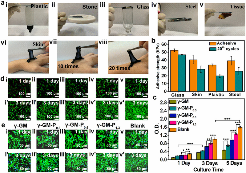 水凝胶性能。(a)黏附性能的展示, (b)与不同材料界面的黏附力,(c-d )生物相容性展示。
