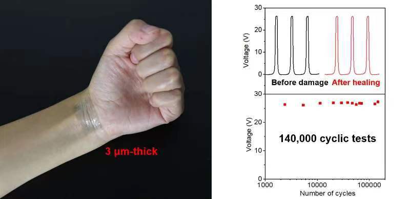 轻薄、透明以及自修复功能的电子皮肤可极大地促进可穿戴电子设备、柔性显示器以及软体机器人的多功能发展。然而,由于对模具的依赖性以及封装问题,目前大多数基于液态离子或者水凝胶材料制备的自修复柔性电子器件的厚度大约在500 μm 到几毫米。同时,一些自修复材料或者电极材料本身的不透明性限制了柔性电子器件在高透光需求场景的应用。开发同时具有轻薄、高透明度和高稳定性的自修复电子皮肤仍然是一个挑战。