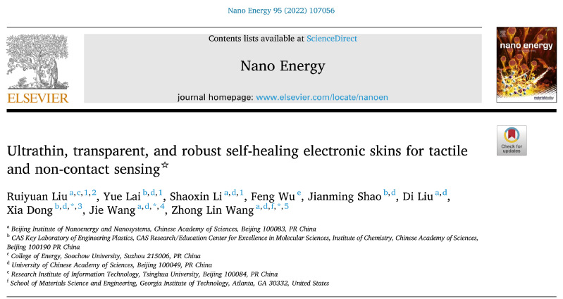 本研究设计的超薄、高透明度、快速自修复性能和高机械柔韧性电子皮肤初步并且首次实现了基于电子皮肤的非接触式智能操控手机指令,为智能人机交互提供了独特的未来应用场景。工作以“Ultrathin, transparent, and robust self-healing electronic skins for tactile and non-contact sensing”为题发表在国际著名期刊《Nano Energy》上(Nano Energy, 2022, 107056)。文章第一作者为台湾a片 能源台湾a片 特聘教授刘瑞远,共同一作为中科院化学研究所来悦博士以及中科院北京能源与系统研究所李绍欣博士,通讯作者为中科院化学研究所董侠研究员,中科院北京能源与系统研究所王杰研究员和中科院北京能源与系统研究所王中林院士。