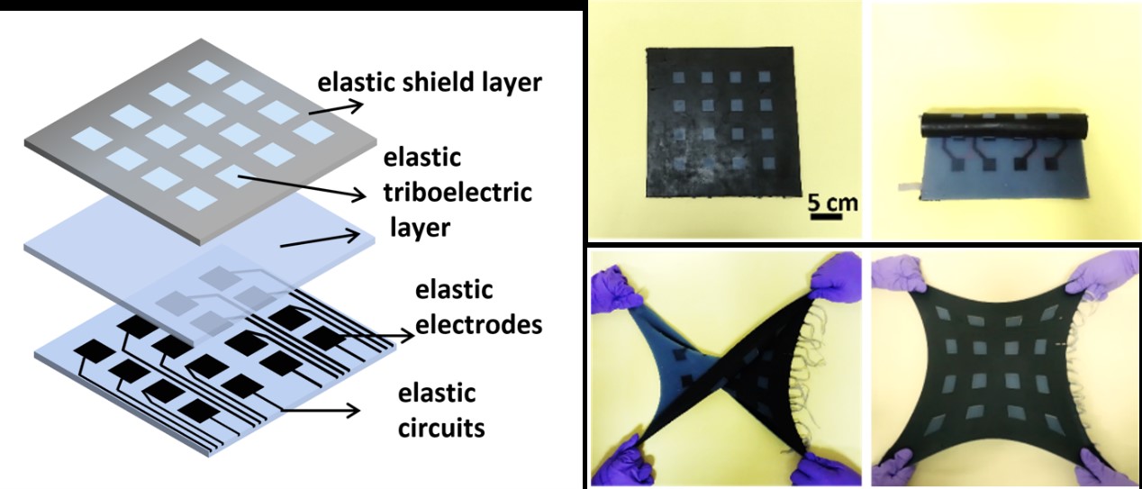 大面积、可拉伸传感器网络是柔性触觉传感、可穿戴电子器件等领域的核心组成部分,基于摩擦纳米发电机(TENG)自供电触觉传感器是其中的一个重要技术方案。然而,在大面积、高密度传感阵列因为受到传感节点和高密度的内部电路之间的信号干扰,往往会导致严重的识别错误。先前的研究通过图案化和精确布线等策略,实现了低识别错误的柔性TENG传感阵列;但是对高识别精度和传感节点、导线、屏蔽层和摩擦起电层相应的机械变形能力的匹配要求,使得开发具有优异拉伸性的大面积复用传感阵列具有极大的挑战性。