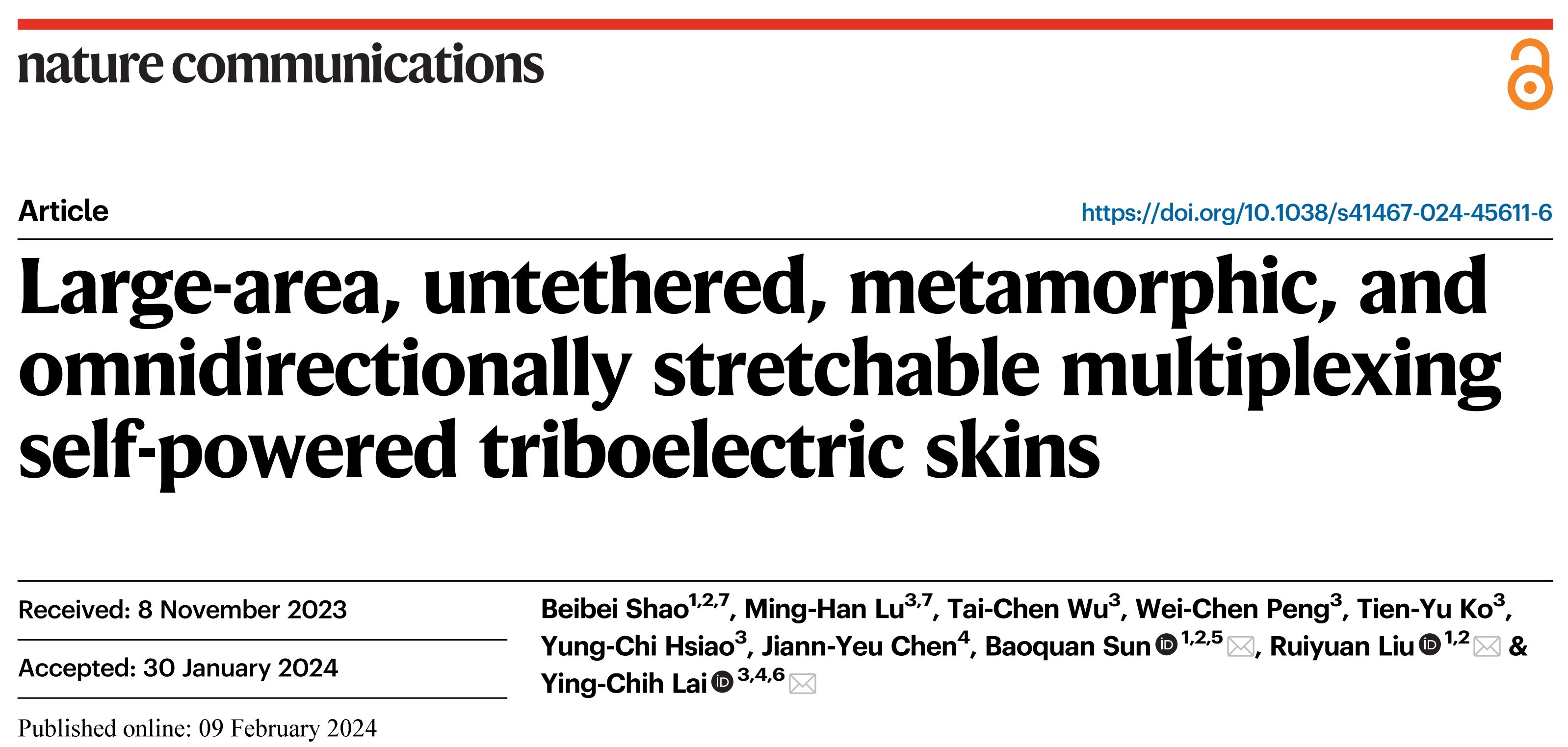 本文报道了一种电信号屏蔽策略,可提供具有超低误识别率(0.20%)的大面积复用自供电无束缚TENG电子皮肤(UTE-skin,25 cm × 25 cm 区域内4 × 4 像素)。开发了基于全向拉伸导电炭黑-Ecoflex复合材料的屏蔽层,可有效消除布线的静电干扰,保证传感矩阵中的低水平噪声。UTE-skin在100%单轴、100%双轴和400%各向同性应变下能可靠运行,实现高质量压力成像和多点触控实时可视化。研究中展示了该成果用于触觉识别的智能手套、用于步态分析的智能鞋垫以及可变形人机界面。该成果近期发表在Nature Communications上,并被编辑选为Devices目录下的亮点论文。论文第一单位为台湾a片 ,通讯作者是台湾a片 刘瑞远教授、纳米科学技术台湾a片 孙宝全教授和台湾中兴大学赖盈至教授。