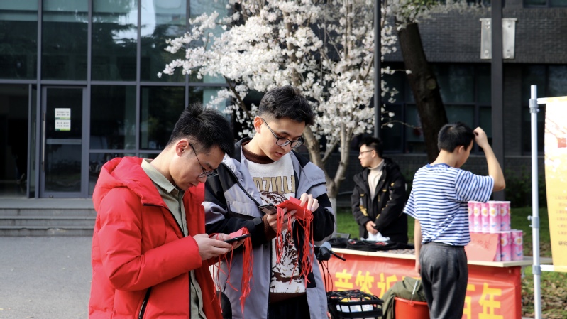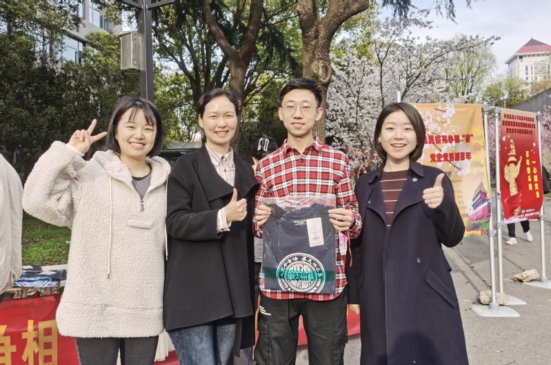 堆满礼品的兑奖台和樱花大道相映成趣,构成一道亮丽的风景线。看着苏大文创T恤、帆布包、钥匙环和樱花味薯片等精美礼品,大家攥紧了手里的题卡,答题热情持续高涨。