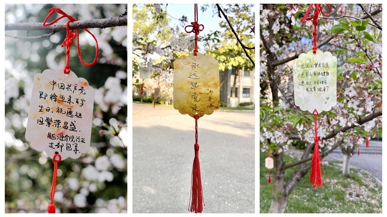 在党委书记沙丹丹、副院长包军的带领下,党员同志们纷纷领取祈愿卡,书写下新时代对祖国和党的祝福,轻轻地系在楼前的樱花树上。轻风徐来,一张张卡片随风飞舞,风儿将我们的祝福带着阵阵樱花香吹向祖国大地。