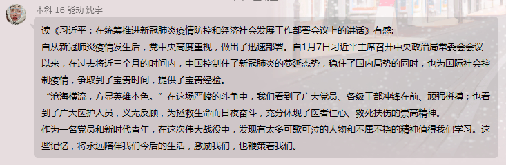 读书会第一次线上活动在同学们激烈的思想碰撞中落下帷幕,学员们在这次活动中收获颇丰,大家更加坚定了自己的政治方向,明确了紧跟时代、主动学习的重要性。同时,在这样一个共同战“疫”的特殊时期,我们为在抗击新冠肺炎疫情斗争中牺牲的烈士们表达深切的哀悼与敬意,真诚地感谢每一个可爱的人——在此次战“疫”中舍己为人、无私奉献的医护工作者和志愿者们。同样,身为新时代青年的我们更应始终牢记自己的使命与担当,不忘初心,继承和发扬在抗疫战争中万众一心、团结勇敢、顽强拼搏、艰苦奋斗的精神品质,努力成为一群拥有远大理想抱负、心存深厚家国情怀的青年。让我们共同守望相助,砥砺前行,为迎接新冠肺炎疫情防控全球阻击战的胜利和中华民族的伟大复兴而继续前行!