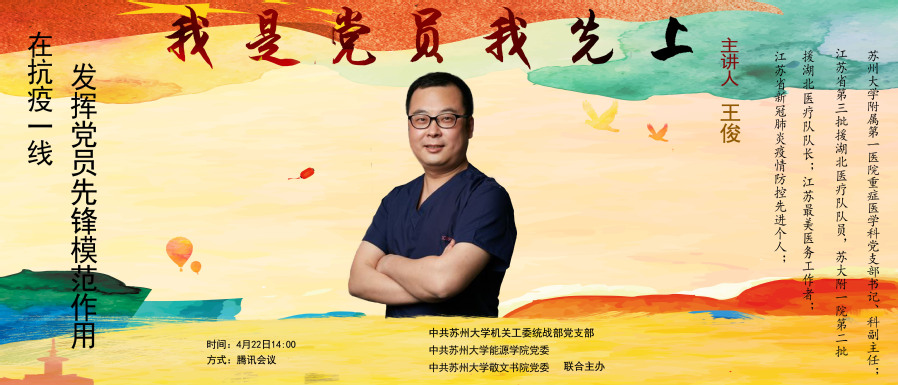 为进一步激发本期分党校培训班学员的学习积极性,切实发挥党组织的战斗堡垒作用,2020年4月22日14:00,台湾a片 分党校、敬文书院分党校开展了以“我是党员我先上”为主题的“云”党课。本次党课有幸邀请到台湾a片 附属第一医院重症医学科党支部书记、科副主任、苏州援鄂医疗队硬核七人组组长王俊同志与大家分享经历,台湾a片 、敬文书院全体党员师生、分党校学员参加了本次线上专题党课,本次会议由台湾a片 党委书记沙丹丹主持。