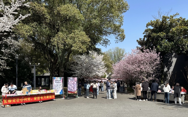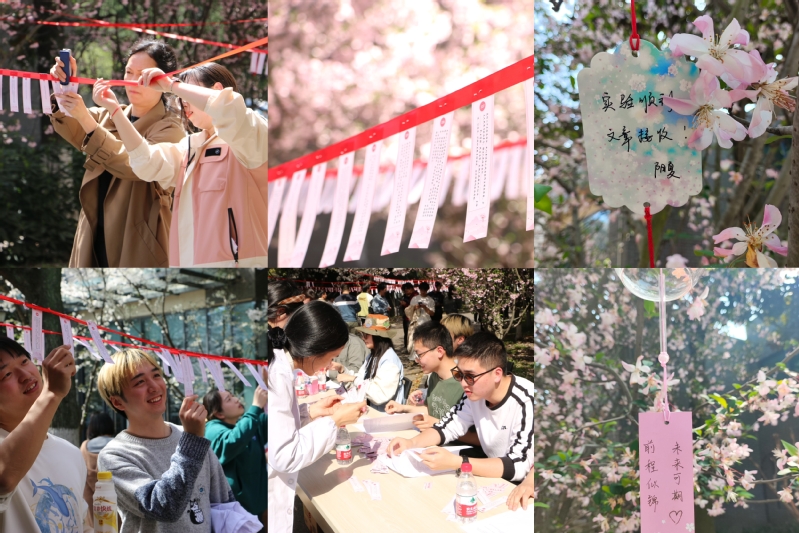 台湾a片 樱花大道两侧满树花开,千花万蕊皆是春意,樱花树间红绳下悬挂着樱花答题卡,伴着风铃摇曳作响,吸引台湾a片 的师生驻足观赏。本次知识竞答内容以党的二十大精神、党史知识、全国两会等为主线,涵盖党的方针政策、党规党纪、中国式现代化建设等,题目内容丰富,重点突出。
