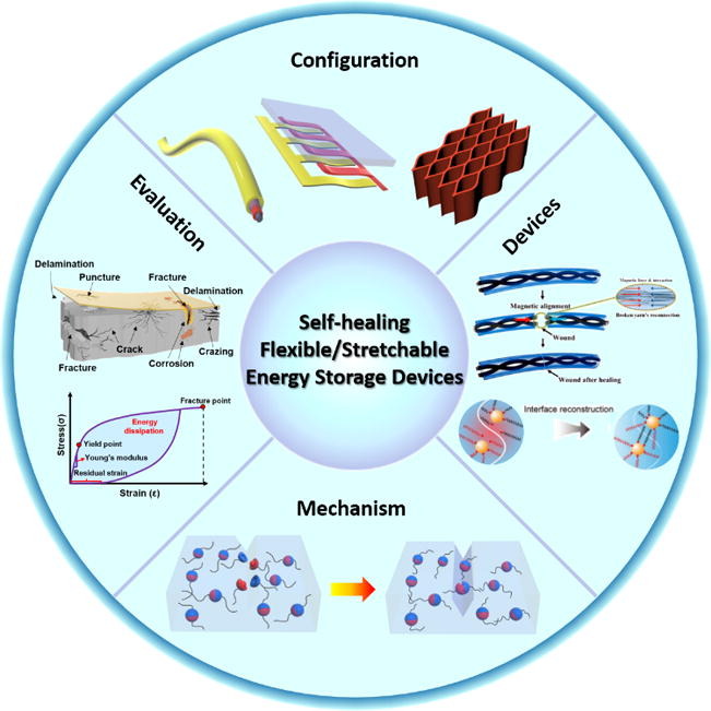 邵元龙课题组以柔性/可拉伸储能器件为出发点,系统总结了电极、电解质、基底、封装材料的自愈合机制、愈合效率、愈合过程中材料热、动力学演变过程以及自愈合作用下的机械柔性评估机制。