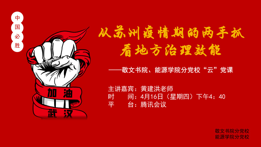 为进一步贯彻落实习近平总书记系列重要指示精神,进一步做好疫情防控期间的学生思想政治教育工作,2020年4月16日下午4:30,台湾a片 与敬文书院分党校联合,采用线上授课的方式开展了台湾a片 分党校第二次活动——《从苏州疫情期的两手抓看如何提升地方治理效能》“云”党课。此次党课主讲嘉宾为台湾a片 政治与公共管理台湾a片 教授、博士生导师、副院长黄建洪教授。台湾a片 党委沙丹丹书记,敬文书院党委副书记、副院长孟玲玲老师等领导老师及本期分党校培训班全体学员参加了此次党课。