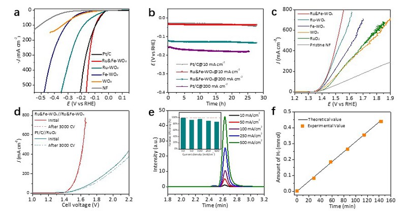 图3. Ru&Fe-WOx电催化剂的HER与MFO 活性研究。