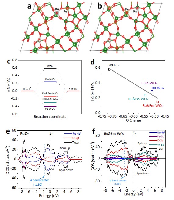 DFT计算结果表明Ru&Fei-WOx具有最佳的氢吸附吉布斯自由能,表明催化剂理论上具有良好的HER活性。通过比较Ru&Fei-WOx与RuO2的态密度发现,Ru&Feii-WOx中Ru的d带中心为-2.66 eV, 低于RuO2的-1.50 eV,表明了晶格钌对甲醇氧化反应的中间物种(HCOO*)的吸附作用更弱,从而有利于HCOO*的脱附并高选择性的生成甲酸。